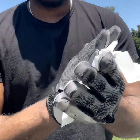 To use our Grip Spray, wear both gloves and spray each glove at least 1 time. Then rub the gloves together repeatedly until the formula evaporates, leaving a fresh, clean surface. *For excessively dirty gloves, you may need a towel to collect some of the removed dirt.
